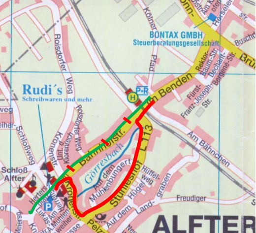 Wir haben daher die Beschilderung der Anfahrt für die Winterlaufserie von der Straße "Im Benden" konmmend ab dem Bahnübergang über die Straßen "Stühleshof"/"Kronenstr." neu ausgeschildert - siehe rote Linie.